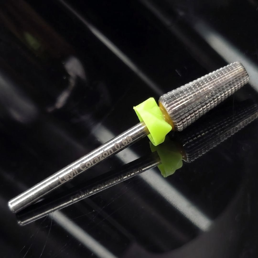 Broca para retiro de uñas artificiales de acero inoxidable abrasivo grueso, con micro cuchillas altamente definidas. La broca con distintivo verde se recomienda para retirar acrilico. Cuenta con corte de cuchillas rectas ideal para zurdos y diestros.