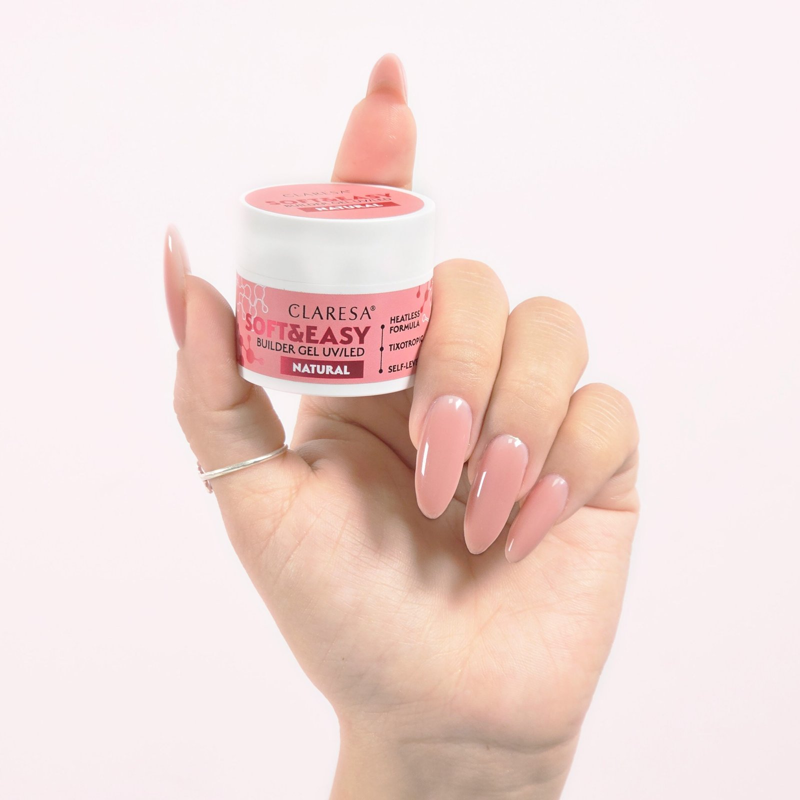 Builder gel autonivelable semiflexible diseñado para nivelar, reforzar uñas naturales y construir estructuras sobre tips y moldes de papel de 2 a 3 cm aproximadamente, ideal para trabajar tecnicas sin limado (tixotrópica)