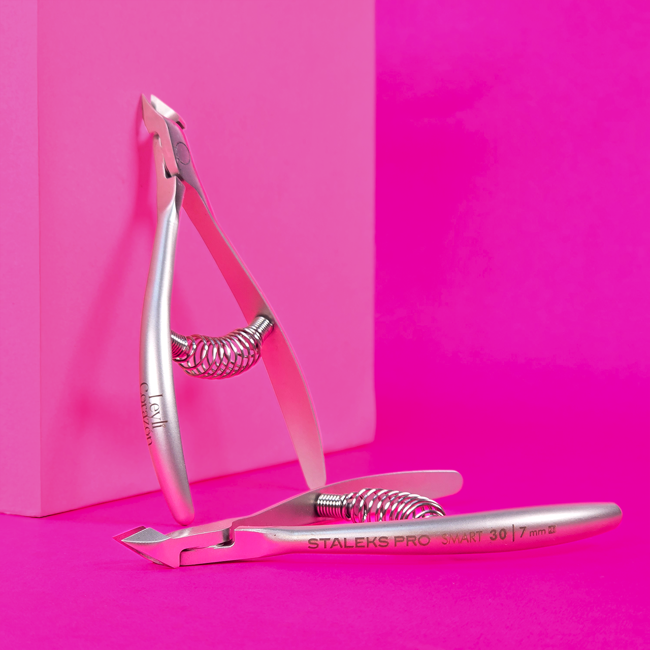 alicate con resorte de talla M marca leyli corazon fabricado por staleks. Hoja de corte afilada manualmente con puntas calibradas de larga duracion. Herramienta esterelizable con quimico, calor seco y autoclave.