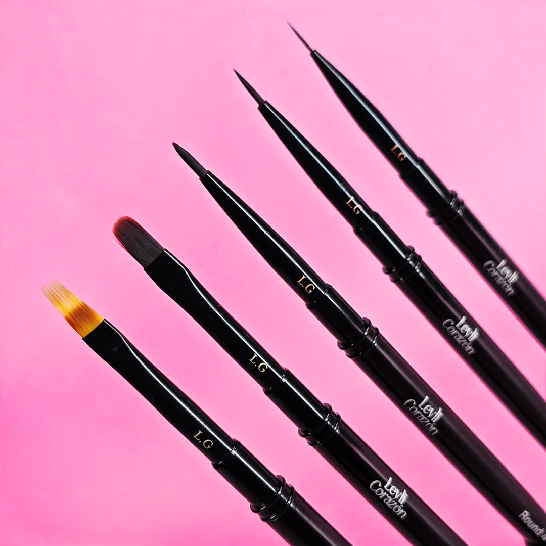 1 pincel lengua de gato para trabajar builder gel y poly gel, 1 round #2 para nivelar builder gel y para multiples diseños (relieves y acuarelas), 1 round #4 para realizar francesas con builder gel (reversa), 1 liner 9mm para multiples diseños y un pincel con cerdas degradadas especial para difuminados y efecto marmol.