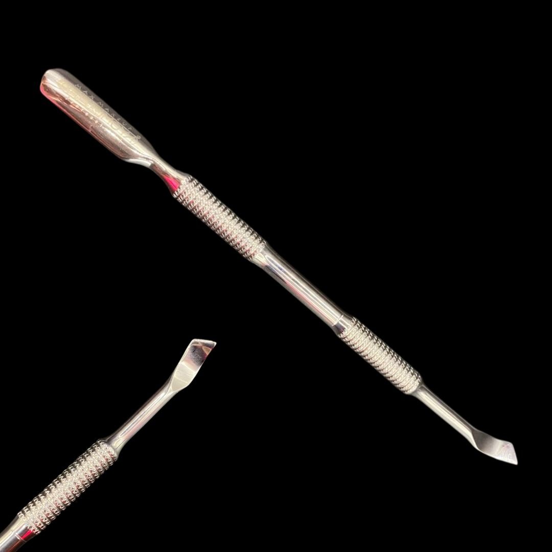 Herramienta profesional con doble punta, ideal para empujar cutículas y limpiar la zona periungueal con precisión.
