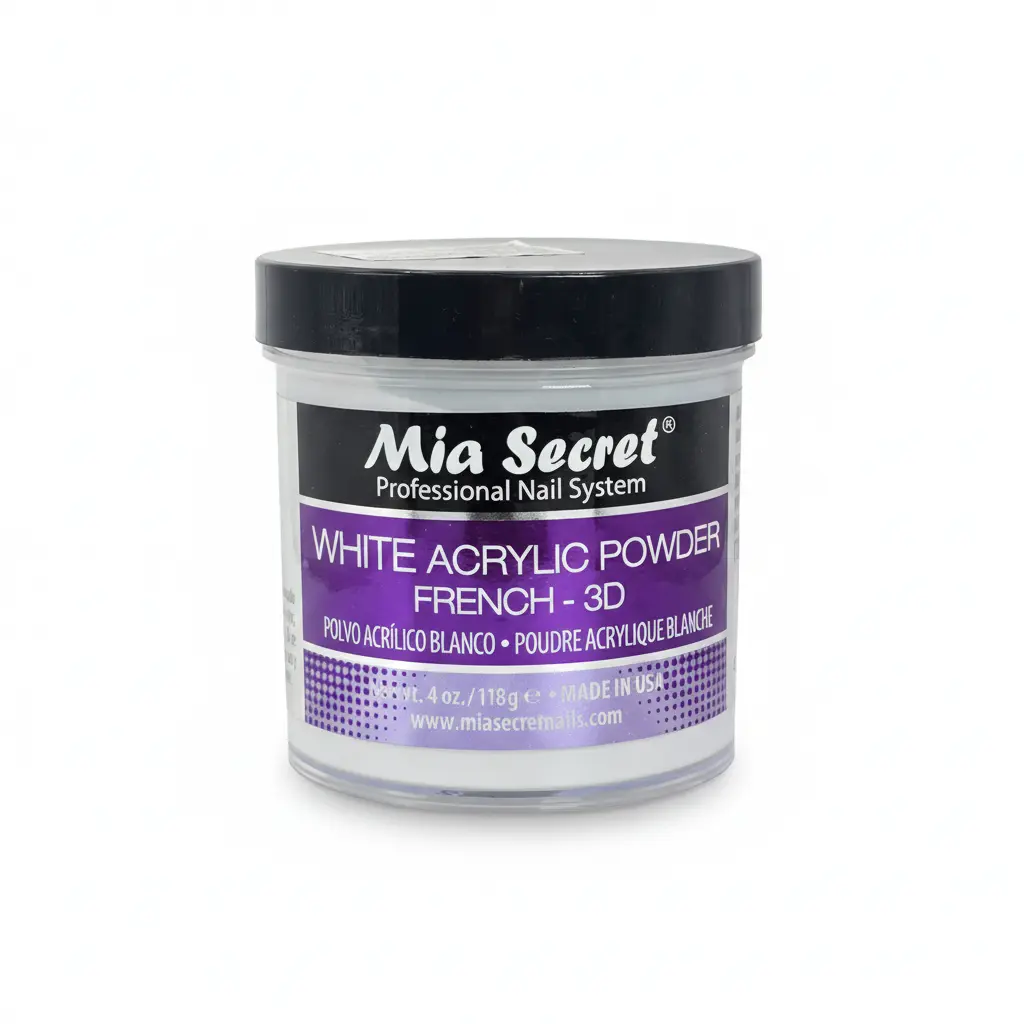 polvo acrílico profesional en blanco puro, ideal para la técnica francesa y detalles de nail art.